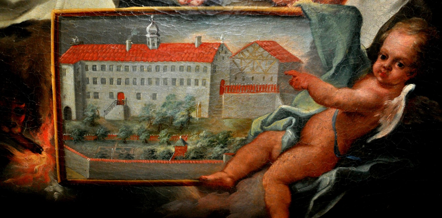 Abb. 2) Ansicht des Klostergartens aus dem Jahr 1731 nach der barockzeitlichen Umgestaltung. Bei der Darstellung handelt es sich um einen Ausschnitt aus dem Altarblatt des Augsburger Kunstmalers Johann Georg Bergmüller (1688-1762), gefertigt im Auftrag der Priorin Hylaria Augustina Buemayrin. (Foto: Isabel David 2018)