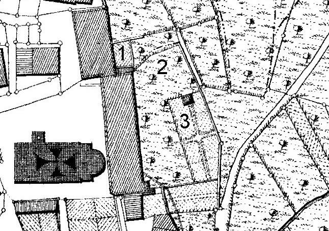 Abb. 3) Historische Flurkarte aus dem Jahr 1838 mit Grundriss des Gartens nach Aufhebung des Klosters im Jahr 1806 (1) Küchengarten, (2) Baumgarten, (3) Kräuter- und Blumengarten. (Mit freundlicher Genehmigung des Landesarchivs Baden-Württemberg, Abt. Staatsarchiv Ludwigsburg EL 68 VI Nr. 15634 Bestand Landesamt für Geoinformation und Landentwicklung Baden-Württemberg: Historische Flurkarten der Württembergischen und Hohenzollerischen Landesvermessung, Ausschnitt Kartenblatt SW XXI 19)