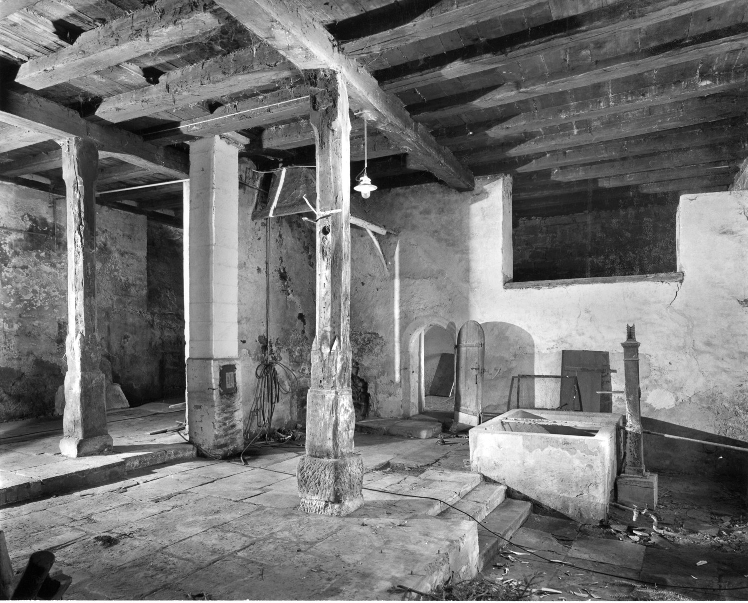 Abb. 15) Das sogenannte «Waschhaus» im Kellergeschoss mit Feuerstelle und Brunnen. Der Laufbrunnen im Keller sowie der Springbrunnen im Garten werden im Zuge der Restaurierung wieder mit Quellwasser aus der bergseitigen Brunnenstube des Klosters gespeist. (Mit freundlicher Genehmigung des Landesamts für Denkmalpflege im RP Stuttgart, Bildarchiv der Bau- und Kunstdenkmalpflege Tübingen, Fotograf Helmut Hell, Aufnahmejahr 1969, Arch.-Nr. 4661)