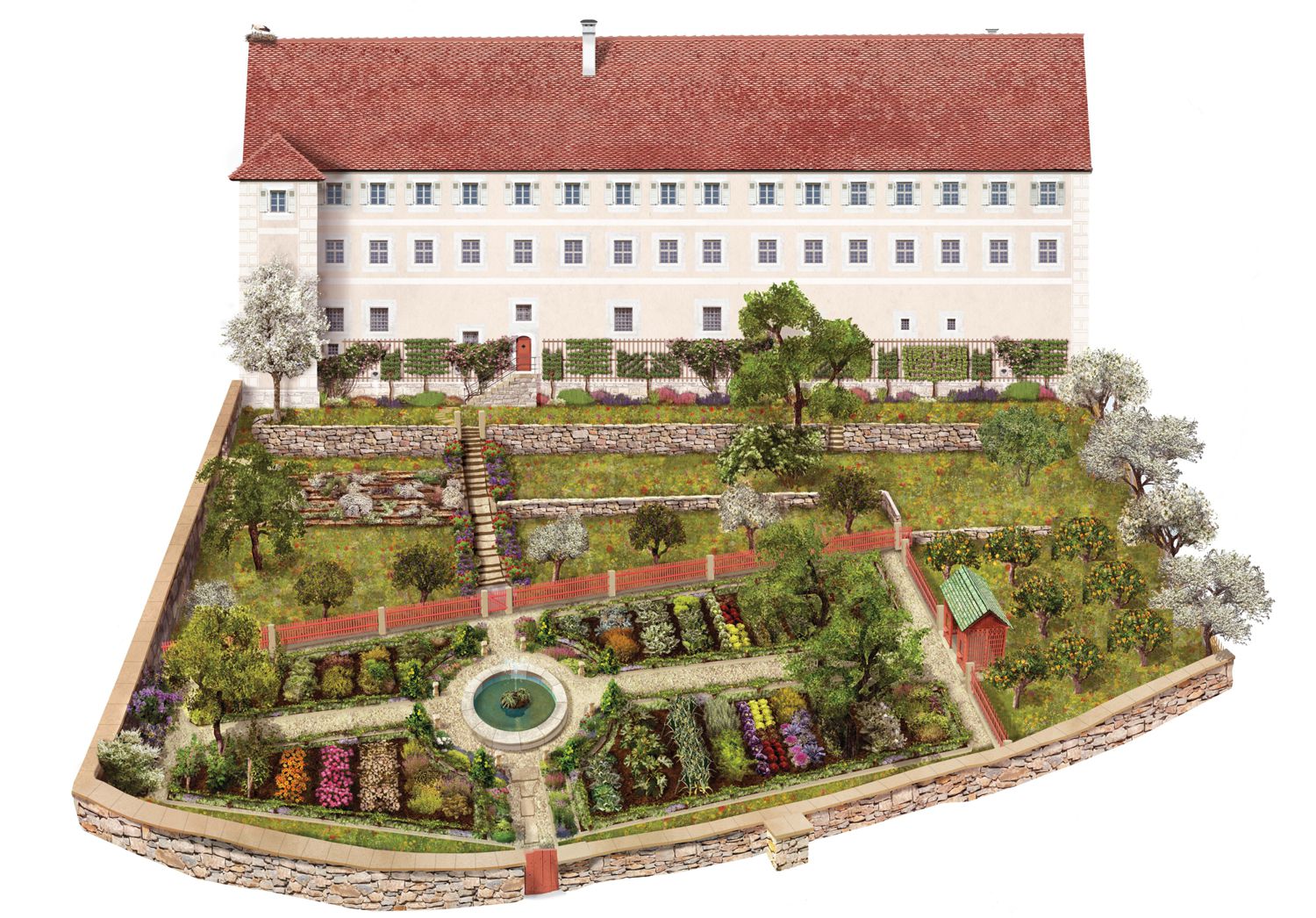 Obwohl der Vorsteher der süddeutschen Ordensprovinz Saxonia den Binsdorfer Klosterfrauen im Jahr 1718 die Arbeit im «Feldt oder Feldt-Geschäft» untersagte, blieb die Arbeit im unmittelbar östlich des Konventgebäudes gelegenen Klostergarten ein fester Bestandteil des klösterlichen Alltags. Im Schutz des ummauerten Gartens kultivierten die Schwestern Küchengemüse, Obst sowie Kräuter und Blumen. Dem Anbau von Heilkräutern im «Blumen- und Kräutelgarten» kam für die Dominikaner-Terziarinnen, deren Wirken in Binsdorf wesentlich von der Krankenpflege geprägt war, eine zentrale Bedeutung zu. Dieser wertvolle Gartenteil mit den seltenen Pflanzen war von einem aufwendig gestalteten roten Staketenzaun eingefasst. Darüber hinaus besaß er repräsentative Ausstattungsmerkmale wie einen Springbrunnen, eine Balustrade sowie einen Treillage-Pavillon mit geschweiftem Dach. In dieser bewusst kunstvollen Gestaltung erschien der «Blumen- und Kräutelgarten» als Ort des Schönen. Ein solches Gartenverständnis lässt sich bereits im 13. Jahrhundert in der naturwissenschaftlichen Schrift «De vegetabilibus» des Dominikanermönchs Albertus Magnus (1193–1280) nachvollziehen. Darin widmete er sich der Anlage von Ziergärten, die er, jenseits des rein Nützlichen, vor allem als Ort des Vergnügens begriff. Diese sollten idealerweise Baumpflanzungen, eine Blumenwiese, Kräuter- und Blumenbeete sowie eine gefasste Quelle aufweisen. Als Provinzial des Dominikanerordens hielt sich Albertus Magnus im Jahr 1268 auch im Dominikanerkloster Rottweil auf, das später die geistliche Betreuung der Dominikaner-Terziarinnen in Binsdorf übernahm. Auf den Garten als Ort des Vergnügens, wie ihn Albertus Magnus in «De vegetabilibus» beschrieb, bezog sich 1454 ebenso der Dominikanerreformer Johannes Meyer (1422–1485) in seinem «Amptbuch», einer Schrift zur Regelung der Ämter eines Dominikanerinnenklosters. Meyer charakterisierte den Klostergarten als einen Ort «zur reinen und ehrbaren Ergötzung der Schwestern». Die Aufgabe, einen solchen Garten anzulegen, oblag nach der Klosterämterbeschreibung Meyers der sogenannten «Gartenmeisterin». Entsprechende Ausprägungen sind bei den Terziarinnen in Binsdorf erkennbar; auch hier war die Verantwortung für den Klostergarten der «Gartenmeisterin» übertragen.